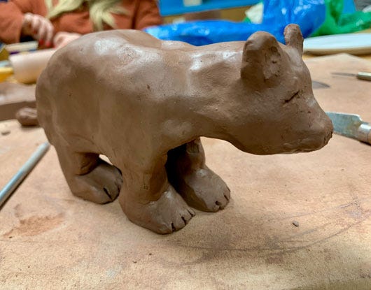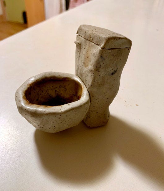 I’m afraid to report that these hopes have crashed down steadily as the class has progressed. A big part of this is the woman teaching it, who I’ll call Martha. Martha’s a pretty interesting ceramic sculptor, but she’s not a very good teacher.* Or even a person very interested in teaching. Her pedagogical technique is to rush through something--say, building on the wheel--really quickly while delivering a muttered, digressive monologue as she goes; it is nearly impossible to extract usable information from these presentations. These demos take up maybe 15 minutes of each 2-hour class session. She spends the rest of the time just sort of abiding, talking to the room or to individuals as we huddle over our little projects, complaining to us about how nobody buys her sculptures, how nobody gives her grants, how the other teachers sharing the course’s kilns are dumb, how her family has a bunch of quite-real-but-maybe-not-the-thing-to-dump-on-your-community-ed-students problems, and on, and on. Ultimately, she reminds me of an unfortunately common personality to run across in the art world: the person who is a moderate amount of talent wrapped around a gigantic need for attention and unfocused validation. I don’t think Martha’s a bad person, but she definitely is in a headspace that’s not great for education; I didn’t walk into that class expecting to hear about her daughter’s struggles working at a downtown strip club, but here we are.